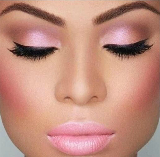 整个妆容都选择暖暖的粉晶色,会不会大招桃花?(开心脸)选择一副浓密的假睫毛,配上珠光粉晶色眼影和唇膏,完全cos芭比娃娃!注意可以用梅紫色眼影在眼尾处和眼眶晕染,增强眼妆的层次感,避免显得很肿。