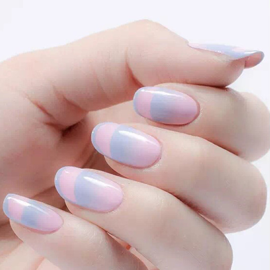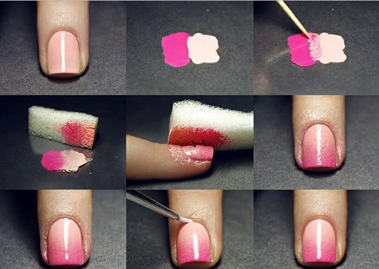 渐变效果操作起来一点都不难,你只需要准备一块海绵和两种颜色的指甲油,就像上面这样。