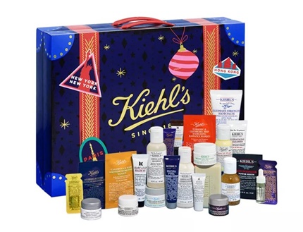 今年科颜氏的圣诞日历和美国插画家 Andrew Bannecker 合作,设计成了一只深蓝色小手提箱,装进了 24 种大家都比较熟悉的产品,比如牛油果眼霜、金盏花水、白泥面膜、护唇膏 1 号等等,算是比较常规的日历了。