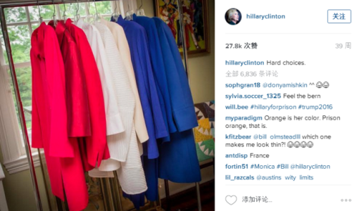 2015年6月,希拉里宣布参选后不久,她在Instagram上po出一张照片,照片上是红白蓝三色套装。她的Twitter认证写道:“一位妻子、一位母亲、一位祖母;家庭的拥护者、美国前第一夫人、议员、国务卿;造型偶像、套装狂热者;2016年总统候选人。”