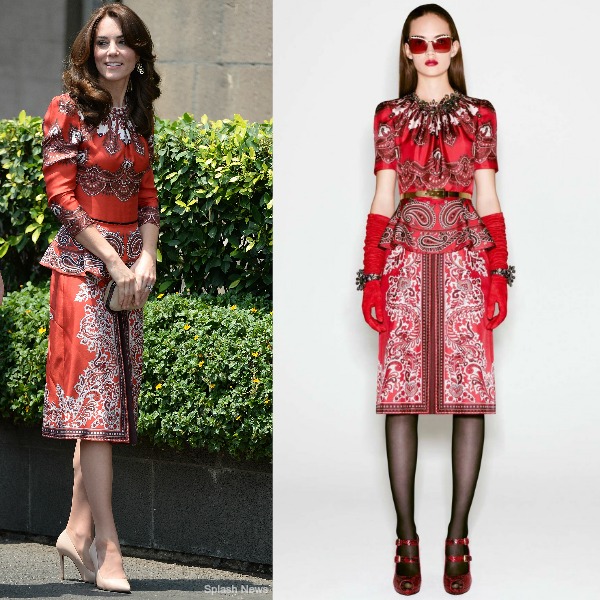 这件红色洋装来自AlexanderMcQueen今年早秋系列,搭配裸色L.K.BennettLondon高跟鞋与同色系Russell&Bromley手拿包。