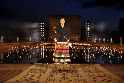 秀场布置用的陶器、靠垫、地毯以及前一天欢迎晚宴的餐盘都是苏马诺协会(Sumano)的作品,这是个旨在复兴摩洛哥部落传统妇女手工艺的协会。开秀模特所穿的一款大衣也是由Sumano编织彩绘的。秀场音乐是现场演奏的酋酋卡(Jajouka),这是一种由打击乐、竹笛和阿拉伯双簧管(ghaïtas)演奏的音乐,已有数千年历史。此外现场还融入了英国“氛围浩室”组合TheOrb创作的电音节奏。