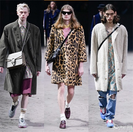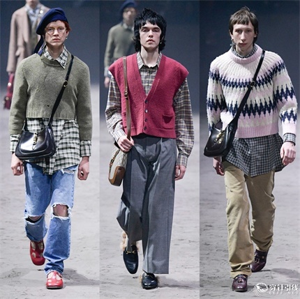 他们可以是多元化的,例如,秀场上模特们身穿修身收腰剪裁的服装,动物刺绣毛衣,宽松的套头衫、格子西装、交叉耳环、玛丽珍长筒袜、娃娃领等服饰,配以明亮的色彩装点,Alessandro Michele大胆地运用迥异的混搭,打破性别界限,重新定义了当代“男性气质”。