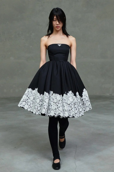 在女装的部分,Miuccia Prada打造了系列小黑裙,采用品牌标志性的尼龙材质制成,兼具了优雅和干练。