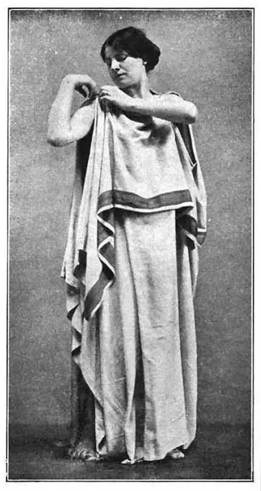 ▲Peplos是给女性穿着的长袍,由正方形布料卷成圆筒状做成,侧边有开口,在肩膀两侧分别用胸针别起来的。