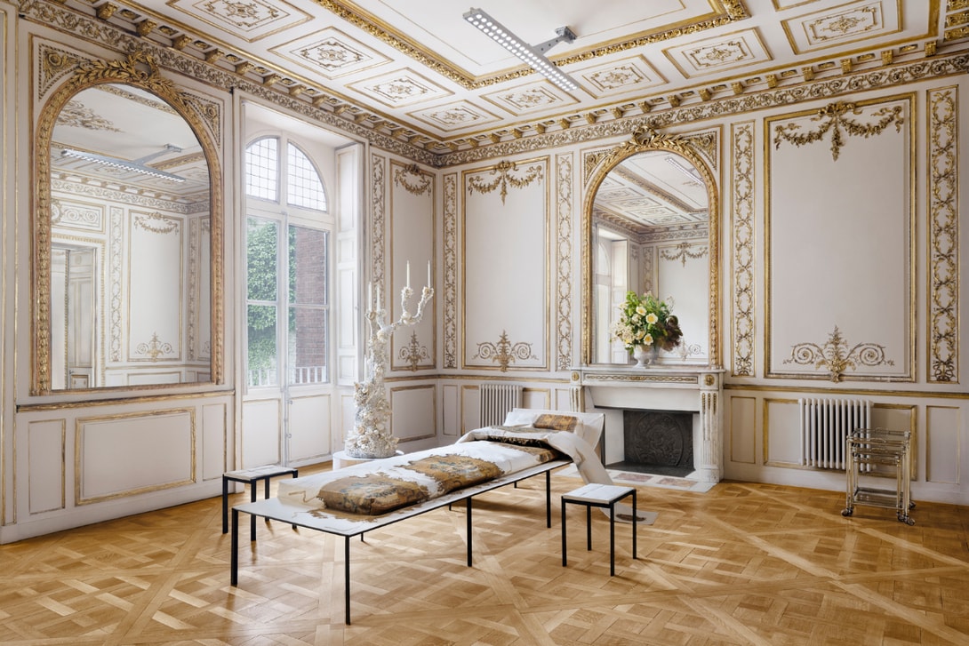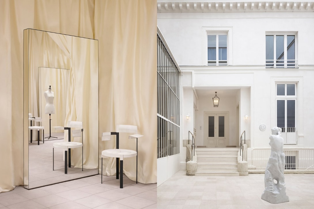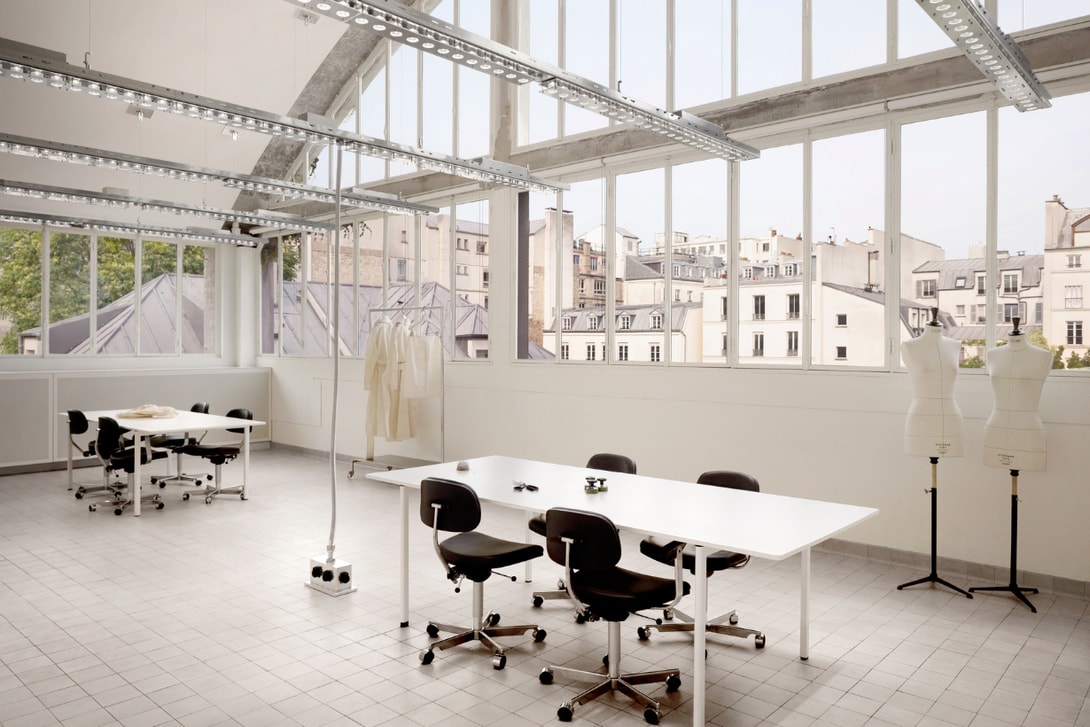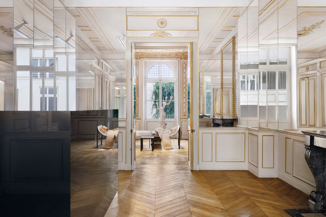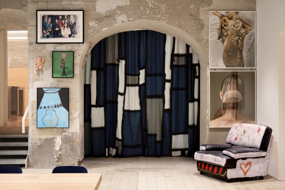 Acne Studios 只对结构进行了最小幅度的干预,保留并突显了建筑原始的美感与特质,走入中央庭院中,可以看到总部入口设立在原 Gomenol 创办人 Prevet 家族的私人府邸,经过极简整理后的庭院,透过艺术家 Daniel Silver 的大理石雕塑营造出整体的古典氛围,在室内则保留了经过修复的金漆线条、木质护墙与人字拼地板,与设计师 Lukas Gschwandtner 的家具以及艺术家 Sylvie Macmillan 的烛台相互映衬。