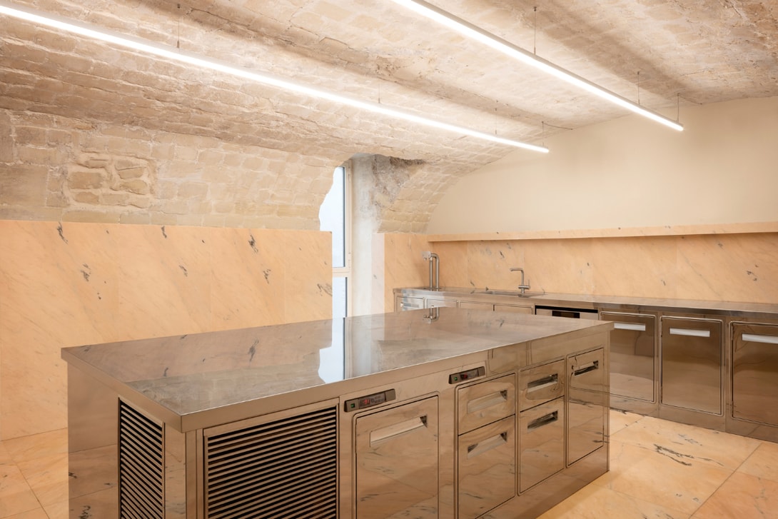 一处光线充足的员工餐厅则保留了原始的磁砖地板,搭配浅色木质长桌与不锈钢现代厨房,呼应实验室的工业工作台面,向建筑原始功能致敬。 而在餐厅外连接一处下沉式花园,设有 Max Lamb 设计的公共座椅。 整座建筑里由长期合作伙伴 Benoît Lalloz 特别打造的灯光装置,细腻呼应了 Halleroed 与 Johansson 的空间叙事,在别具意义的历史建筑中,还藏着多位曾与品牌合作的艺术家作品,打造出这座具有创意能量的新总部。