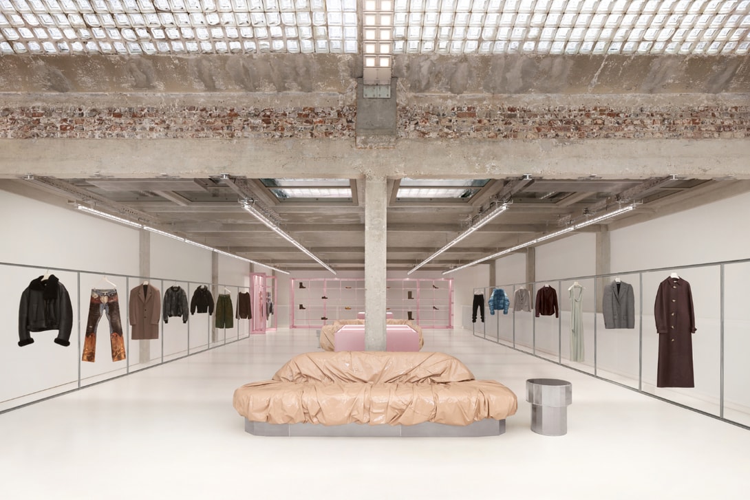 前实验室之中的展厅,以裸露的混凝土柱与原始拱形玻璃砖天花板呈现,与纯白墙面形成鲜明对比,空间中的新旧元素清晰分明,如由 Max Lamb 设计的两张 monumental 沙发,被 Acne Studios 标志性的亮泽粉红乙烯基包覆,成为展厅中的焦点; 隐密感十足的 VIP 试衣间,则透过挑高巨型帘幕围合,搭配 Gschwandtner 设计的座椅,取材自人体曲线的轮廓,延续其为品牌大秀打造的布景灵感。