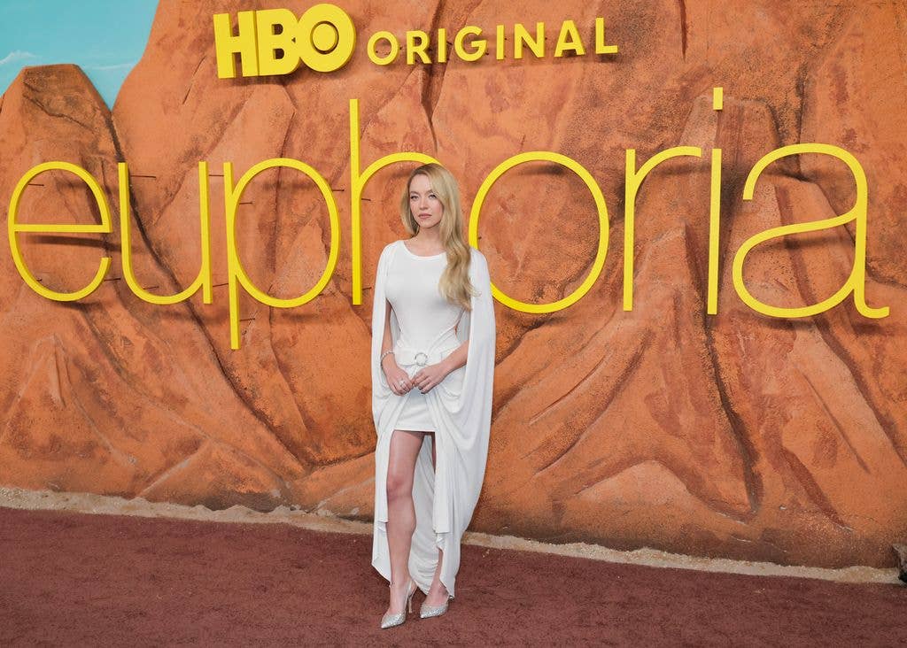 悉尼·斯威尼在 《 亢奋》 第三季首映礼上身穿这件白色皮埃尔·卡丹礼服,表现惊艳。收紧的腰线展现了她的身材,而拖地披风则增添了一丝戏剧感。她用闪耀的配饰和华丽的妆容,打造出经典好莱坞造型。