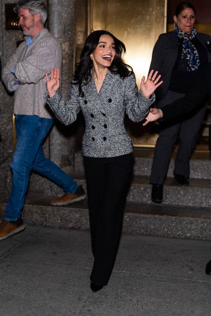 Rachel Zegler 向我们展示了如何在纽约保持优雅和时尚。这位女演员将一件结构感十足的灰色粗花呢西装外套配上醒目的黑色纽扣,搭配一条光滑直筒的黑色裤子。她以经典尖头高跟鞋和简约金饰品完成造型,增添了精致感。