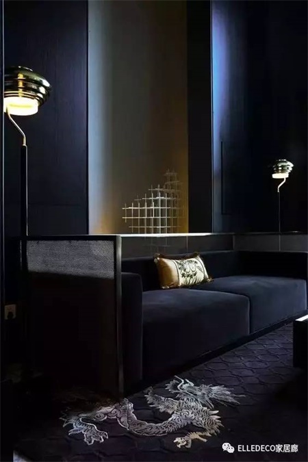 当黑色为主,金色为点缀时,黑色的材质多加变化,例如绒质与平面的对比会让视觉减少沉闷感。