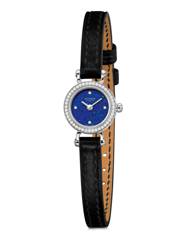 2014年 Hermès(爱马仕)推出Faubourg腕表,15.5毫米的表盘搭配上玫瑰金链带或是牛皮表带,因其小巧精致而颇受欢迎。今年在圣诞新年之际,爱马仕又对Faubourg腕表的设计加入了巧思,表盘材质加入了青金石、缟玛瑙和孔雀石的选择。微细之中沉淀优雅,臻极完美。在这节日气氛中,不失为送给女士的最佳礼物。