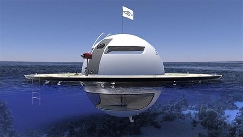 这款游艇分为上下半球,高度是6米,中间由浮在水面上的圆盘隔开,这个直径12.5米的圆盘就是甲板,可以晒日光浴,可以作为花园,还可以在上面骑自行车。游客可以在上半球里休闲放松,也可以到下半球里淋浴,欣赏海洋生物。