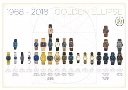 Golden Ellipse 在百达翡丽的各大腕表系列中历史极为悠久,仅次于诞生于1932年的 Calatrava 。它体现了百达翡丽的标志性设计,历经 50年时尚潮流与时代标志的变迁,经典依旧。这款腕表诞生于 1968年,在当时显得既大胆前卫,又和谐优雅,散发别具一格的魅力。别致的椭圆形表壳介于圆形与矩形之间,搭配闪烁着神秘深邃光泽的蓝金表盘。这款腕表均衡的比例灵感源自“黄金分割”(又称“神圣比例”,比值为 1 : 1.6181...)。自古希腊数学家发现该比例以来,它就成为众多建筑与艺术杰作的基础。