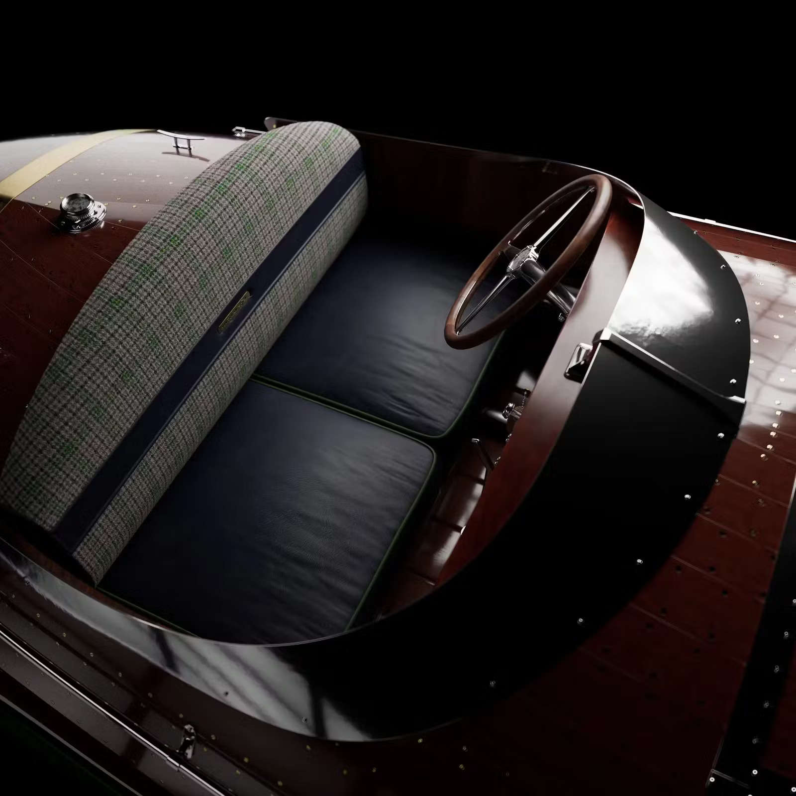 从车削铝制仪表板到粗花呢包裹的挡泥板,这艘快艇的剪裁工艺堪比萨维尔街的任何剪裁典范,而这种执着正是 Huntsman 的传承。近两个世纪以来,Huntsman 在定制领域锋芒毕露,其西装包含 28 个独立尺寸,从零开始绘制纸样,一件西装夹克的手工工序长达 80 小时。在萨维尔街,这种精准度在意料之中,但场景若是换到水上,大概率我们不会找到多少艘用如此精细布料剪裁的船只。Miss Moonshine 犹如身披三件套绅士赛车服,证明了定制文化也可以装点波光粼粼的生活方式。