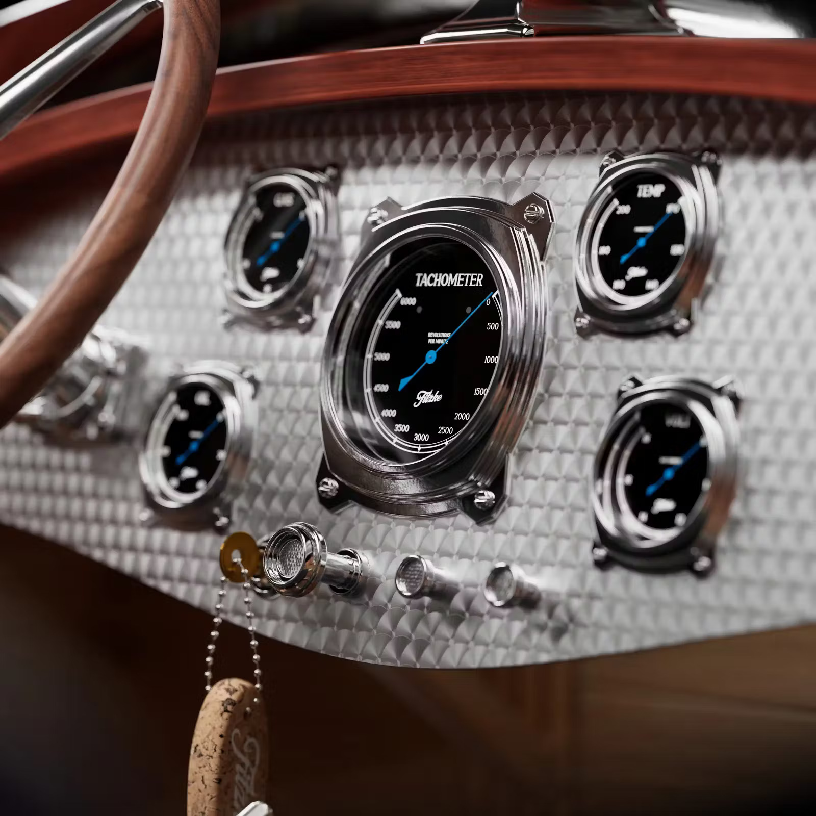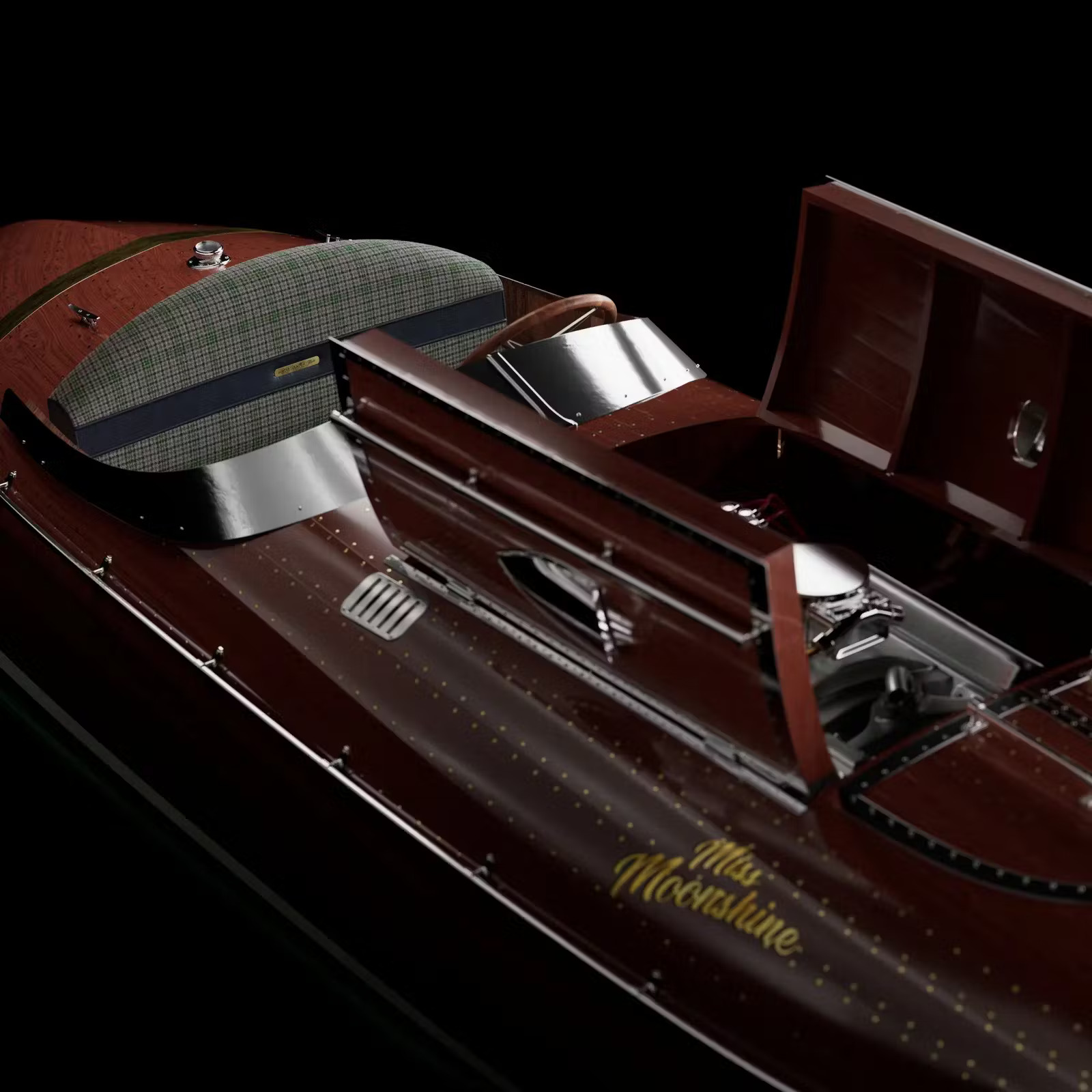 Huntsman 与来自明尼苏达州的船厂 Fitzke Boatworks 联手,打造了一艘“绅士快艇”—— Miss Moonshine 。这是一艘满载 20 世纪早期赛车风格的高速动力艇,采用定制粗花呢装饰。船长 23 英尺,采用桃花心木和西班牙雪松木打造,搭载手工制作的 5.7 升 V8 发动机,伴随坚韧的航海级粗花呢面料,足以抵御海浪。Fitzke 甚至还找到老式缝纫机来缝制内饰,只为达到与 20 世纪 20 年代原版船艇相同的工艺水平。