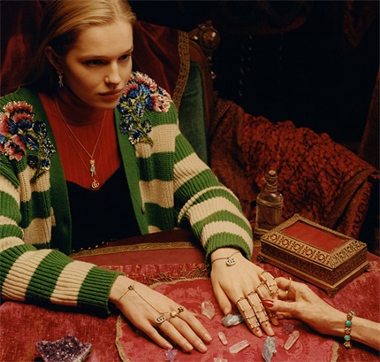 请来好莱坞老牌女星出演,GUCCI 把这次的拍摄场地选在了洛杉矶,打造了一间神秘、复古又华丽的占卜屋。店铺的招牌和内部装饰都有手相占卜的霓虹灯牌,这个设置就比较巧妙了,因为腕表首饰系列的重点就在手上,大片中各种手部特写来得非常自然。