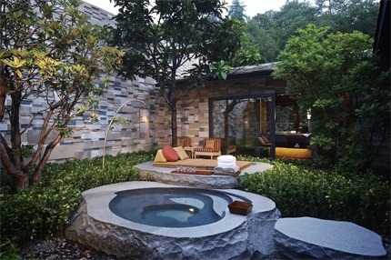酒店总共设有50个独栋别墅,背靠着山,宽敞的小院里有一个用整块花岗岩凿出的温泉池。